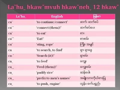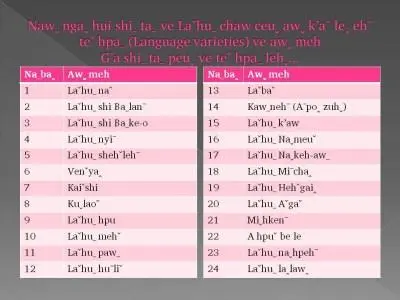 လားဟူဖတ်စာကိုလေ့လာသင်ယူနိုင်ပါသည်။ ဒေါင်းလုတ်ဆွဲယူရန် လားဟူစာအခြေခံ (48.56 MB) ပြရန် လားဟူစာသင်ယူတတ်မြောက်ပြီးသူများအတွက်(ဆရာကိုင်) (6.29 MB) ပြရန် လားဟူစာသင်ယူတတ်မြောက်ပြီးသူများအတွက်(တပည့်ကိုင်) (6.19 MB) ပြရန်